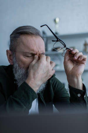 tired senior man with beard touching closed eyes and holding eyeglasses