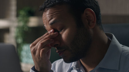 Tired Indian man guy American businessman feel pain eyestrain eyes discomfort computer work tired laptop online working monitor screen irritation take off glasses dry eyesight bad vision headache