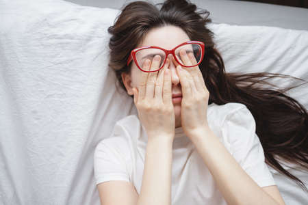 Young woman rubs her eyes after using glasses. Eye pain concept, poor vision. High quality photo