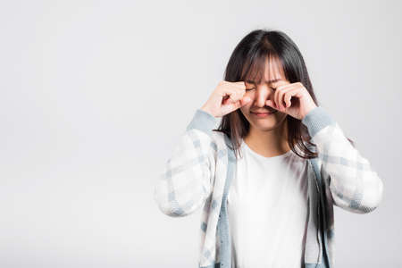 Unhappy woman bad mood her cry wipe tears with fingers, Asian beautiful young female stress feeling sad unhappy crying, studio shot isolated on white background with copy space