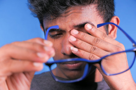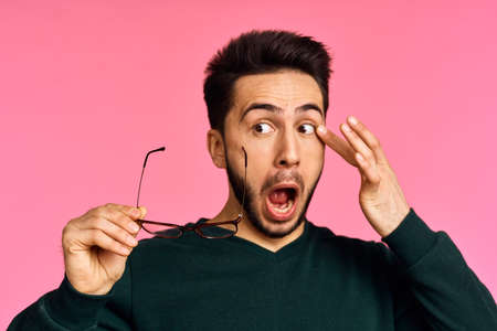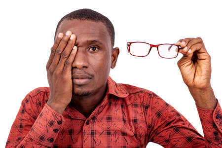 Person with visual fatigue isolated, Man with glasses with visual fatigue, concept of person with asthenopia, Person with glasses with visual pain