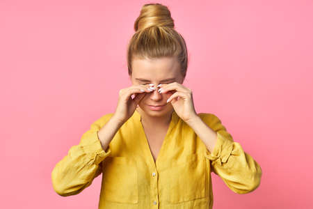 young woman in a yellow t-shirt on a pink background scratches her eyes.