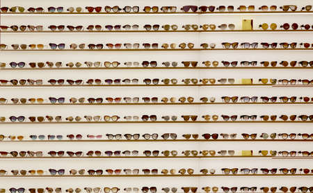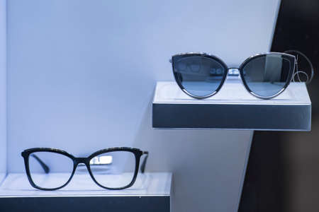 Glasses on display in an optical store. sale of frames for glasses and sunglasses.