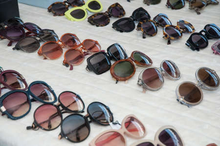Set of colorful sunglasses for sale in a store. Different sunglasses on light coloured background. Summer eyeglasses.Fashion collection