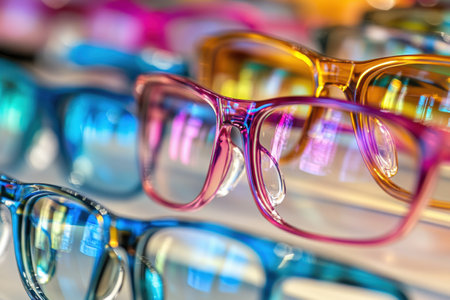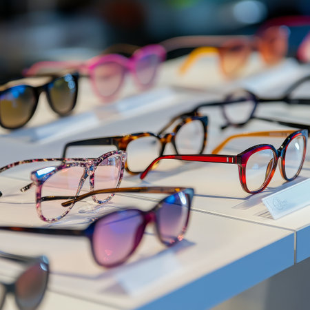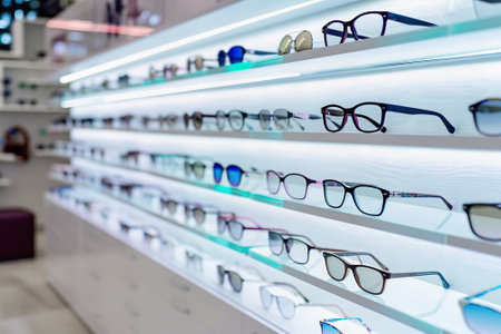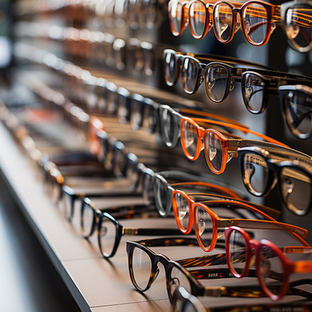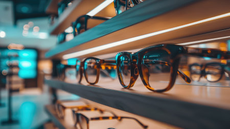 Stylish eyeglasses are neatly arranged on a glass shelf, showcasing the latest trends in eyewear fashion and eye care