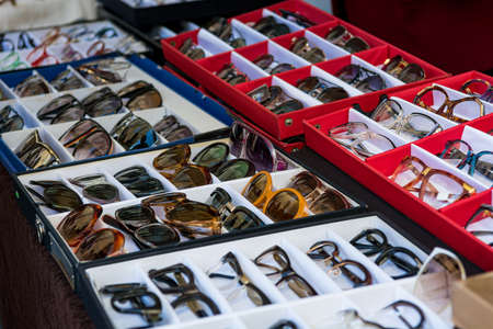 Outdoor stand with many different fashionable glasses being sold.