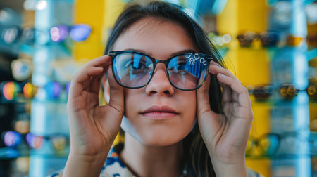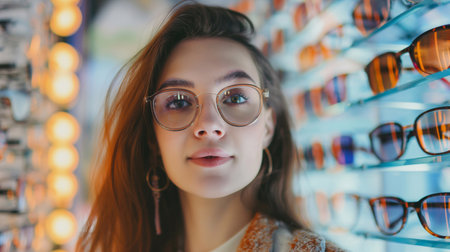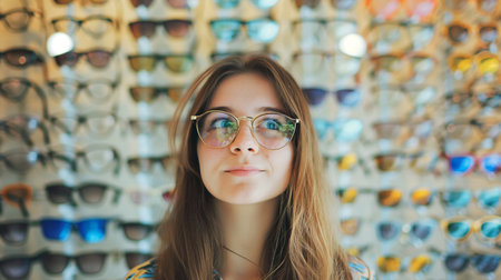 In an optometry shop, a woman's grin radiates as girl tries on the perfect pair of glasses, a reflection of her unique style in front of a showcase of various eyeglass frames