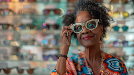 An old smiling black woman tries on glasses in front of a showcase of various eyeglass frames in an optometry shop. Senior lady with her vibrant personality and unwavering confidence