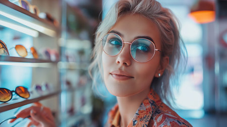 With enthusiasm, a lady choosing eyeglasses, a practicality and personal expression. A smiling woman tries on glasses, standing in front of a display of various eyeglass frames in an optometry shop
