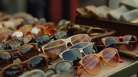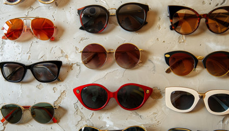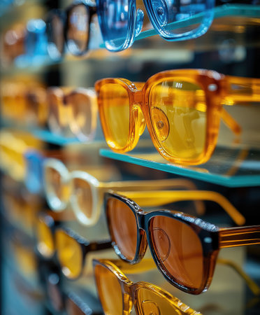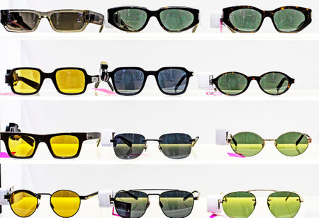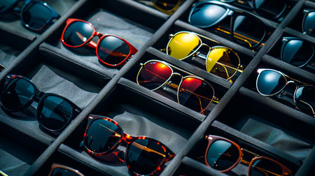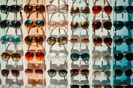 A variety of stylish sunglasses sits neatly on display in a retail store. Bright colors and unique designs attract customers as they browse for the perfect accessory. The store ambiance is vibrant.