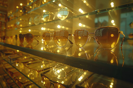 Stylish sunglasses are placed on a counter next to a mirror, illuminated by warm light reflections creating an inviting atmosphere.