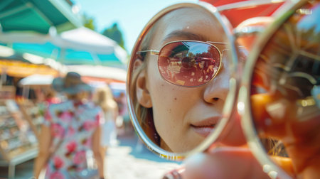 A vibrant pair of sunglasses filled with colorful glitter and confetti reflects a joyful atmosphere, perfect for celebrations and fun events.