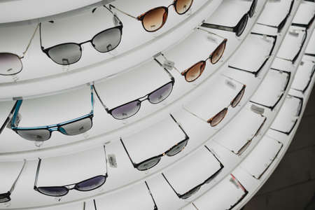 sunglasses of different shapes and designs on display in a supermarket. Protecting eyes from the sun and wrinkles