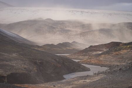 Volcanic landscape during ash storm on the Fimmvorduhals hiking trail. Iceland.