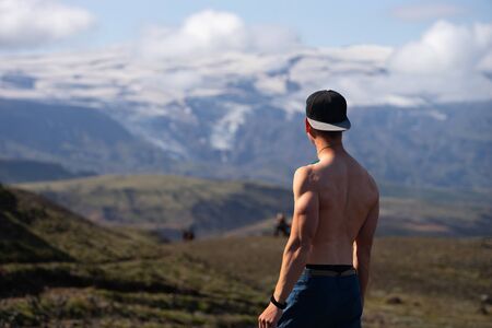 Backside of tall muscular caucasian man with naked torso standing in over mountain and sky background. Promoting active, sport and healthy lifestyle.