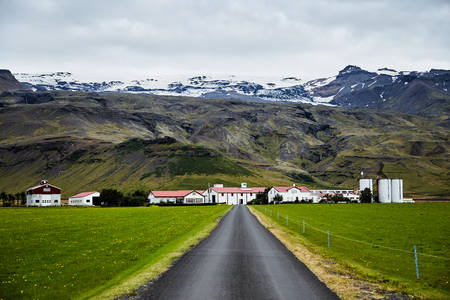 Typical Icelandic landscape with white houses red roof against mountains in small village in South Iceland.