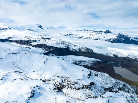 Aerial glacier with ash streaks against volcanic slope in Iceland