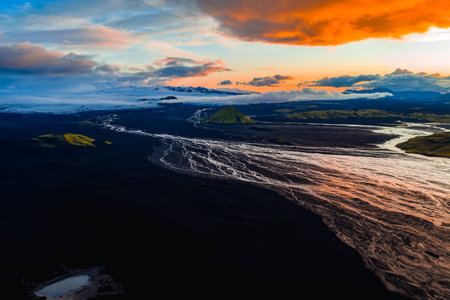 Aerial drone photograph image of a glacial river system in the south of Iceland during midnight sun and sunset. Glacier riverbed, delta in Iceland.