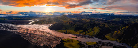 Aerial View of Icelandic Volcanic Terrain at Sunset with Glacial Rivers