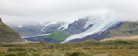 beautiful icelandic scenery with glacier and grassland, covered in clouds glacier
