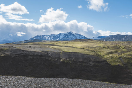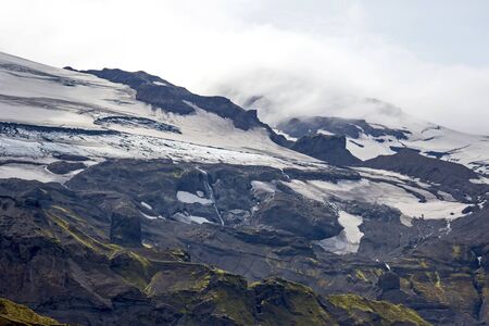 Volcanic landscape with glacier, rocks and ash on the Fimmvorduhals hiking trail. Iceland.