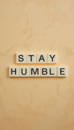 An inspiring message created with letter tiles, urging viewers to stay humble. The soft beige background enhances the simple yet impactful design, perfect for home or office decor.