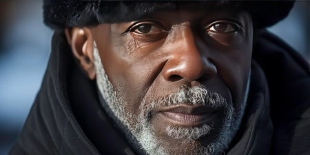 Stylish senior black man with beard and hat, exuding wisdom in a city setting. AI generative.