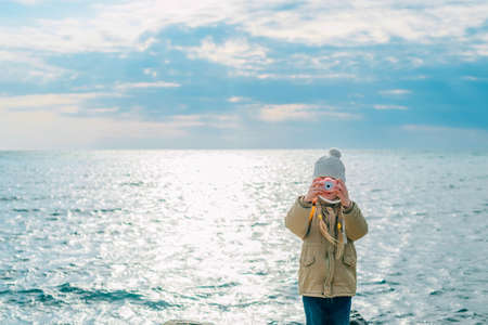 a little girl squinting photographs the autumn, spring seascape on a childrens pink camera. the child is passionately engaged in his hobby: photography. high quality photo