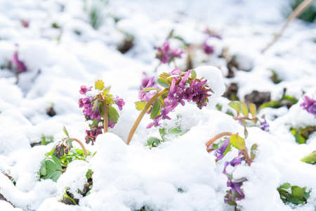 A pink Corydalis cava flower covered in fresh snow symbolizes natures resilience during the transition from winter to early spring