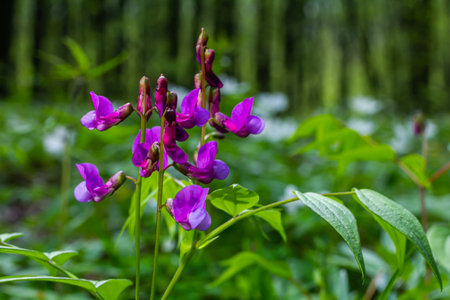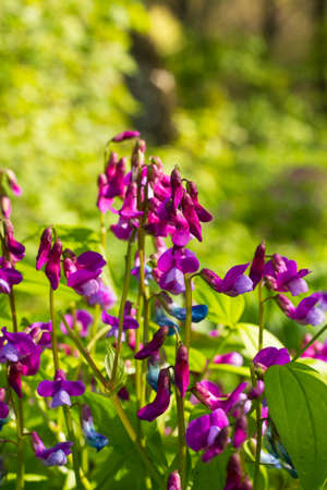 Flowers of spring vetchling Lathyrus vernus plant in wild nature. May.