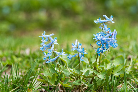 Corydalis, flowering primroses, happy afternoon in the forest, close-up