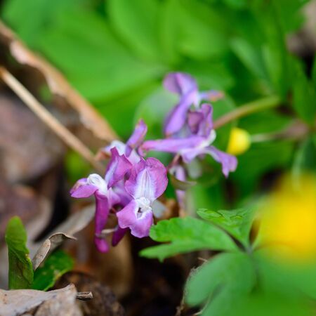 Corydalis. Corydalis solida. Violet flower forest blooming in spring. The first spring flower, purple. wild corydalis in nature.