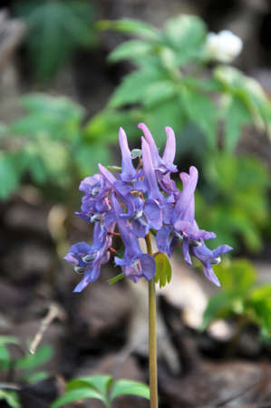 The purple Corydalis blossom in the early spring in a forest with a blurred background - Kyiv, Ukraine, Europe.