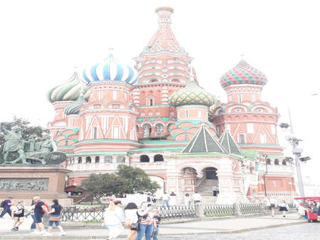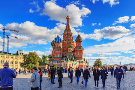Moscow, Russia - September 30, 2018: Tourists walk on Red Square near Moscow Kremlin on a background of St. Basil Cathedral in sunny day