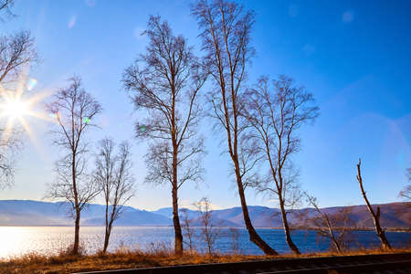 Winter landscape: trees on the background of Lake Baikal, in place of the mouth of the Angara River, Russia