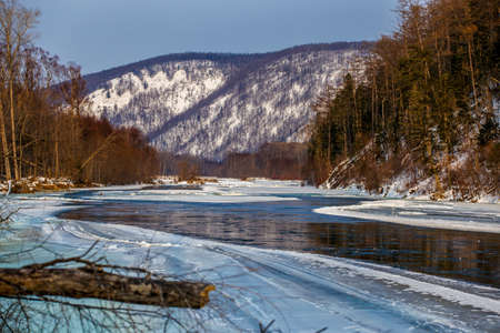 Winter landscape with the Katun River and snow-capped mountains. Altai Republic, Western Siberia, Russia