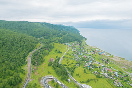 The Baikal serpentine road - aerial view of natural mountain valley with serpantine road, Trans-Siberian Highway, Russia, Kultuk, Slyudyanka