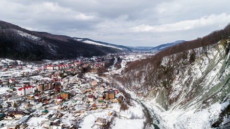 Aerial view of Carpathian mountains in winter, Yaremche, Ukraine.