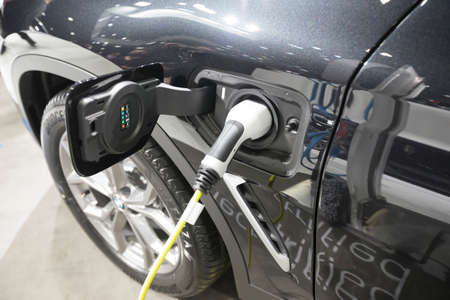 Nonthaburi , Thailand - April 3, 2019: close up electric charging for bmw eco car in motor show Thailand .