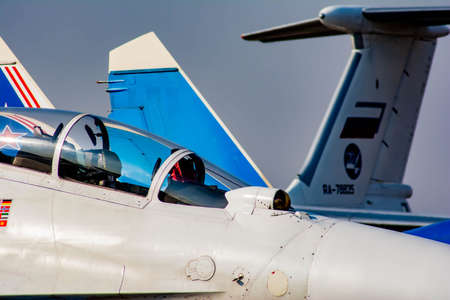 Aviation pilots demonstrate high aerobatics on fighters. Aircraft bombers in the blue sky. Military aircraft in the sky