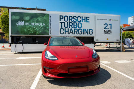 Murcia, Spain - July 31, 2021: Red Tesla Model 3 electric car is charging at Porsche and Iberdrola Turbo Charging Station. The location is a mall in Murcia, Spain.
