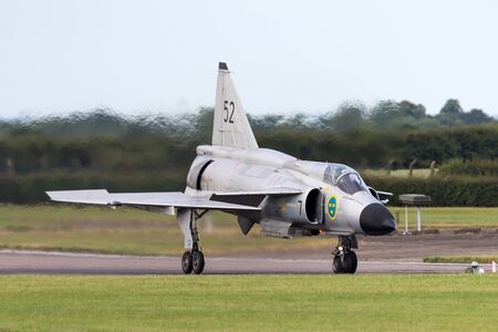 RAF Waddington, Lincolnshire, UK - July 6, 2014: Swedish Air Force Historic Flight Saab AJS-37 Viggen fighter aircraft SE-DXN.