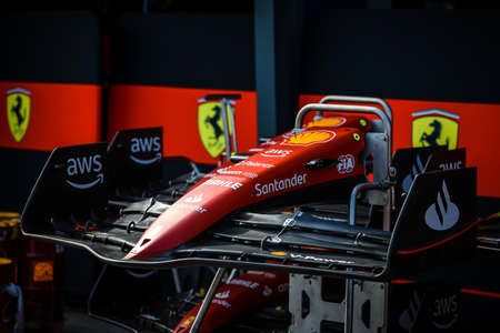 Novosibirsk, Russia - 11.01.2019: Cockpit and steering wheel view of red Ferrari racing sports cars for Formula 1 on the street near the garage box.