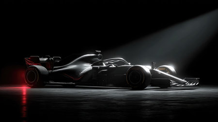 Discover this modern, high performance formula one racing car. Its sleek black and red design and advanced aerodynamic features are beautifully showcased in a dramatic studio setting with reflections.