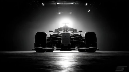 This captivating image captures the striking silhouette of a race car, set against a dramatic backdrop of bright light. The high contrast emphasizes the sleek design and powerful presence, evoking a sense of speed and innovation in motorsport.