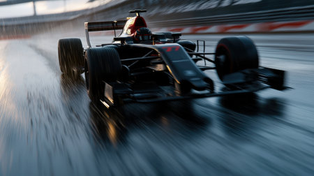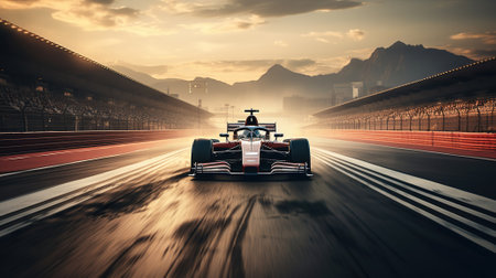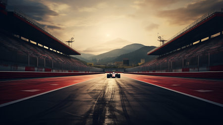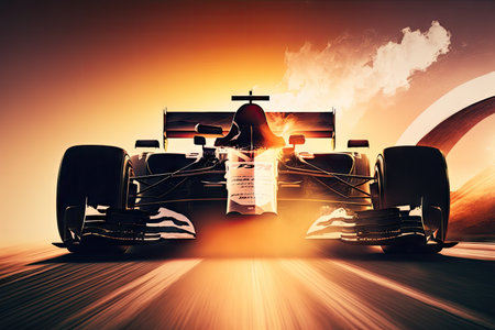 A Photo realistic image of Formula 1 car on racetrack at sunset, showcasing its sleek design and powerful stance