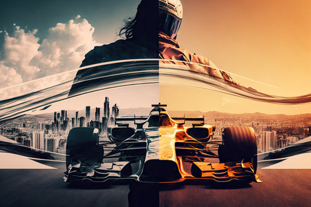 racing car driving along racing track highway against cityscape double exposure, created with generative ai
