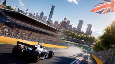 Race car speeding on a city track, with a crowd in the stands and skyscrapers in the background, under a clear blue sky with a British flag. Concept of extreme sport.
