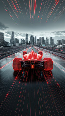 Red race car speeding on a highway with a futuristic cityscape backdrop, conveying speed and technology. Concept of extreme sport.