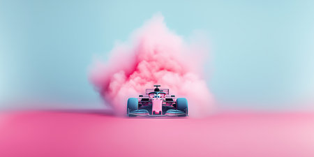 Pink Formula 1 car leaving a trail of pink smoke as it races on a white track against a blue background.